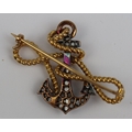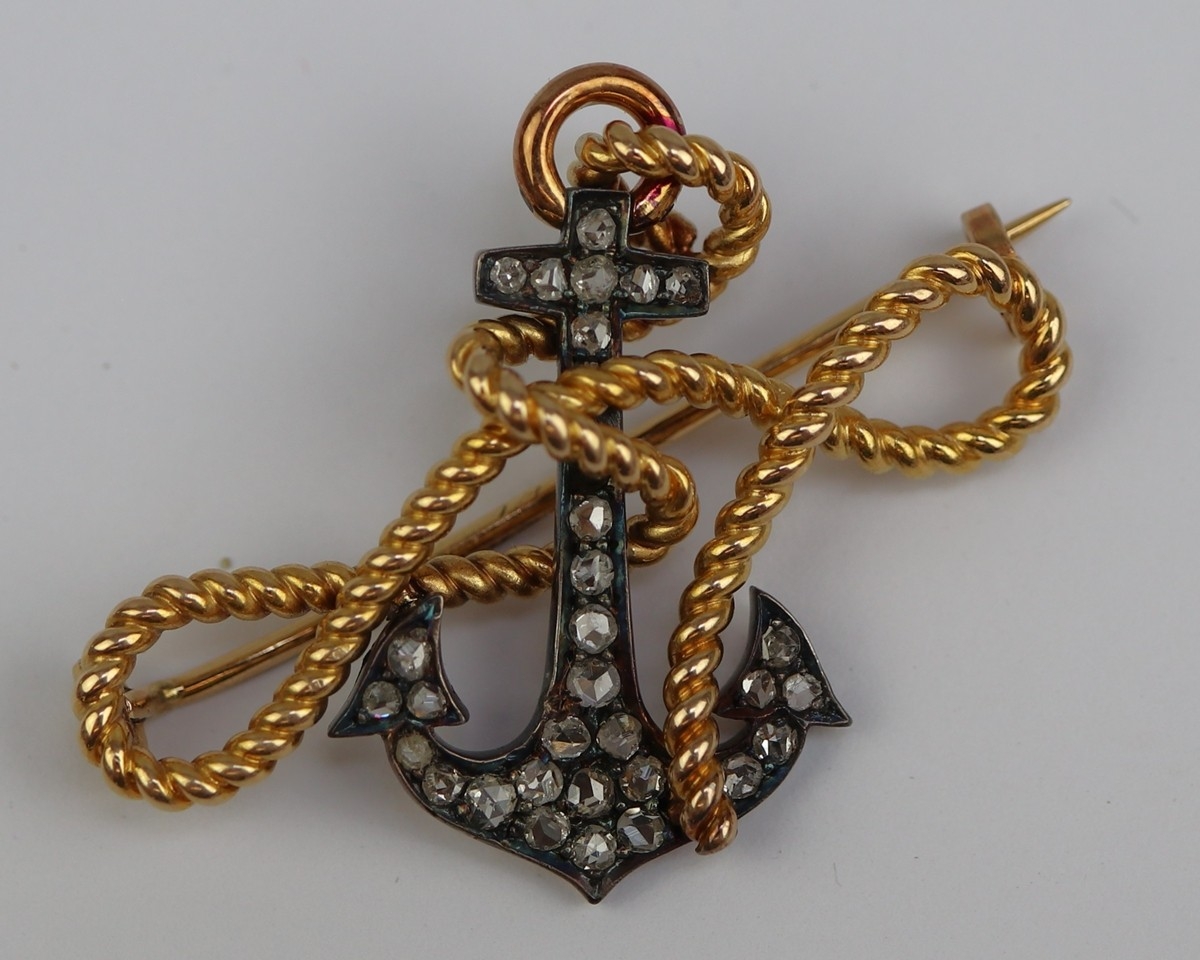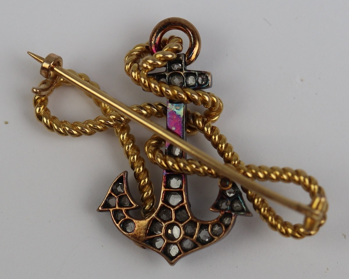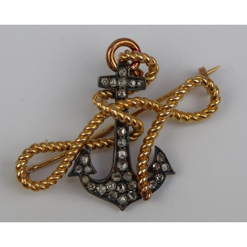 Fine quality 18ct gold and silver rose cut diamond set anchor brooch - bespoke, hand made, Silver set, rose cut diamond Anchor brooch with gold pin fastener and gold rope work to the front.