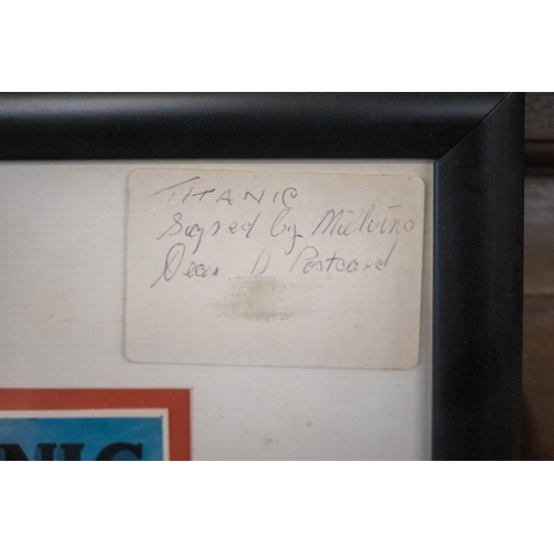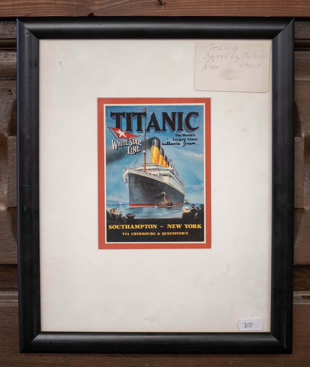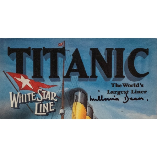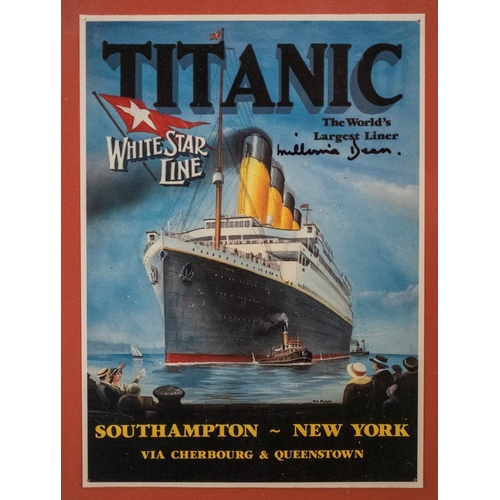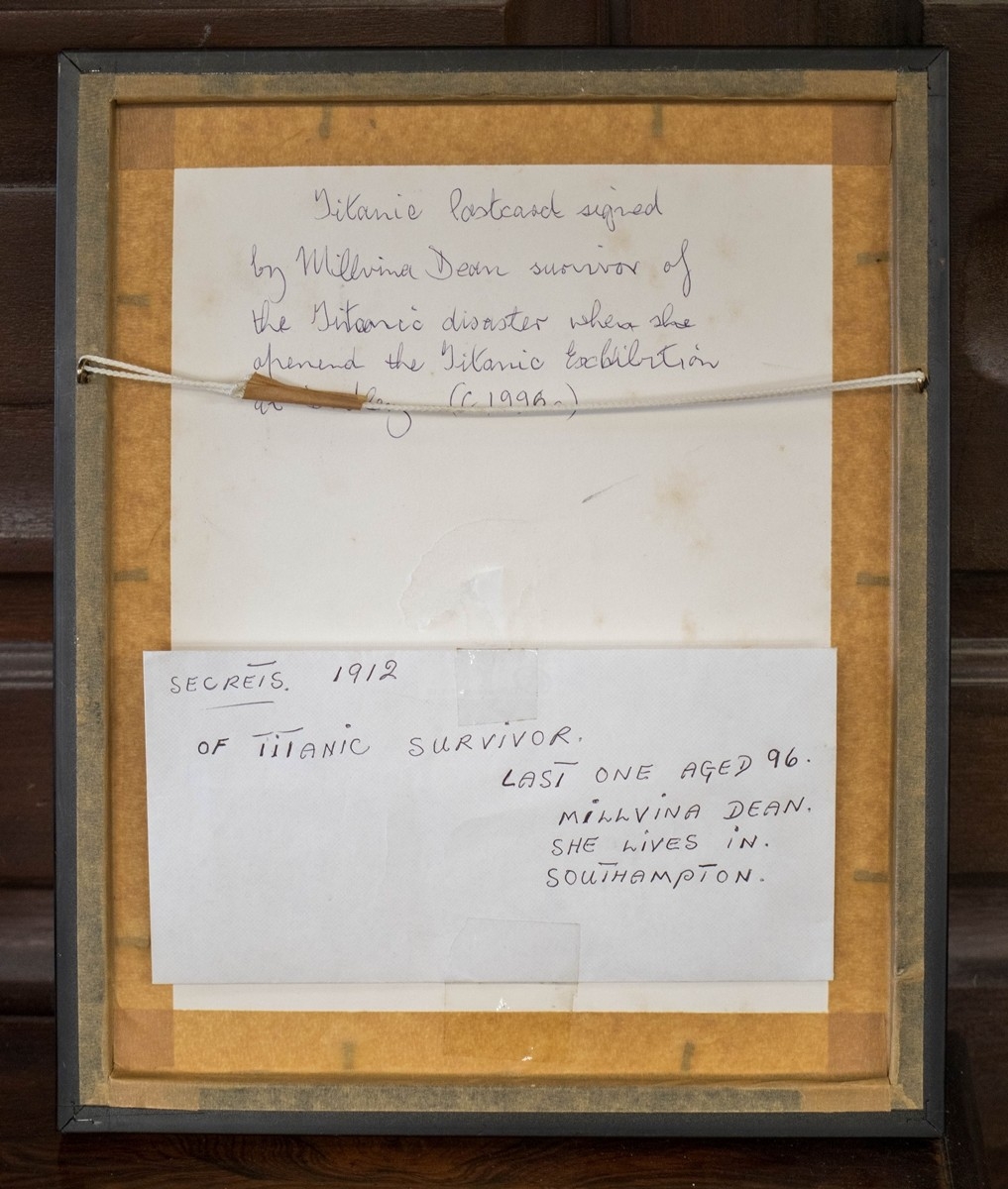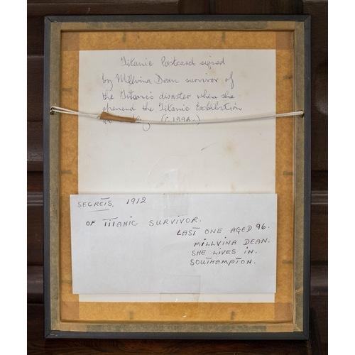 Signed Titanic postcard signed by Millvina Dean at the Titanic Exhibition, Dudley, 1996. At the time Millvina was the sole survivor. She was just 2 months old when the Titanic sank in 1912. Millvina passed away in 2009 aged 97. Postcard size is 10cm x 14cm