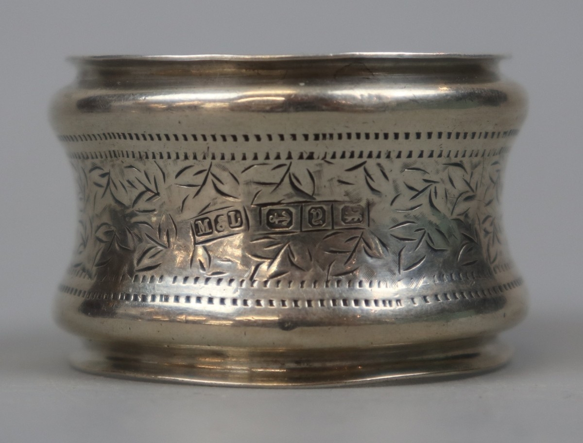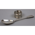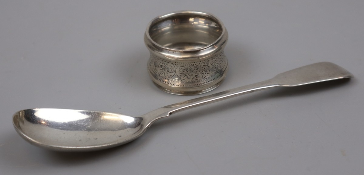 Antique hallmarked silver spoon and napkin ring. 52g approx