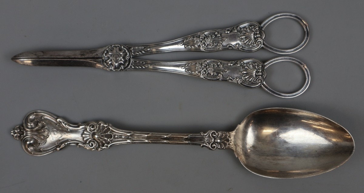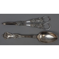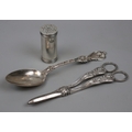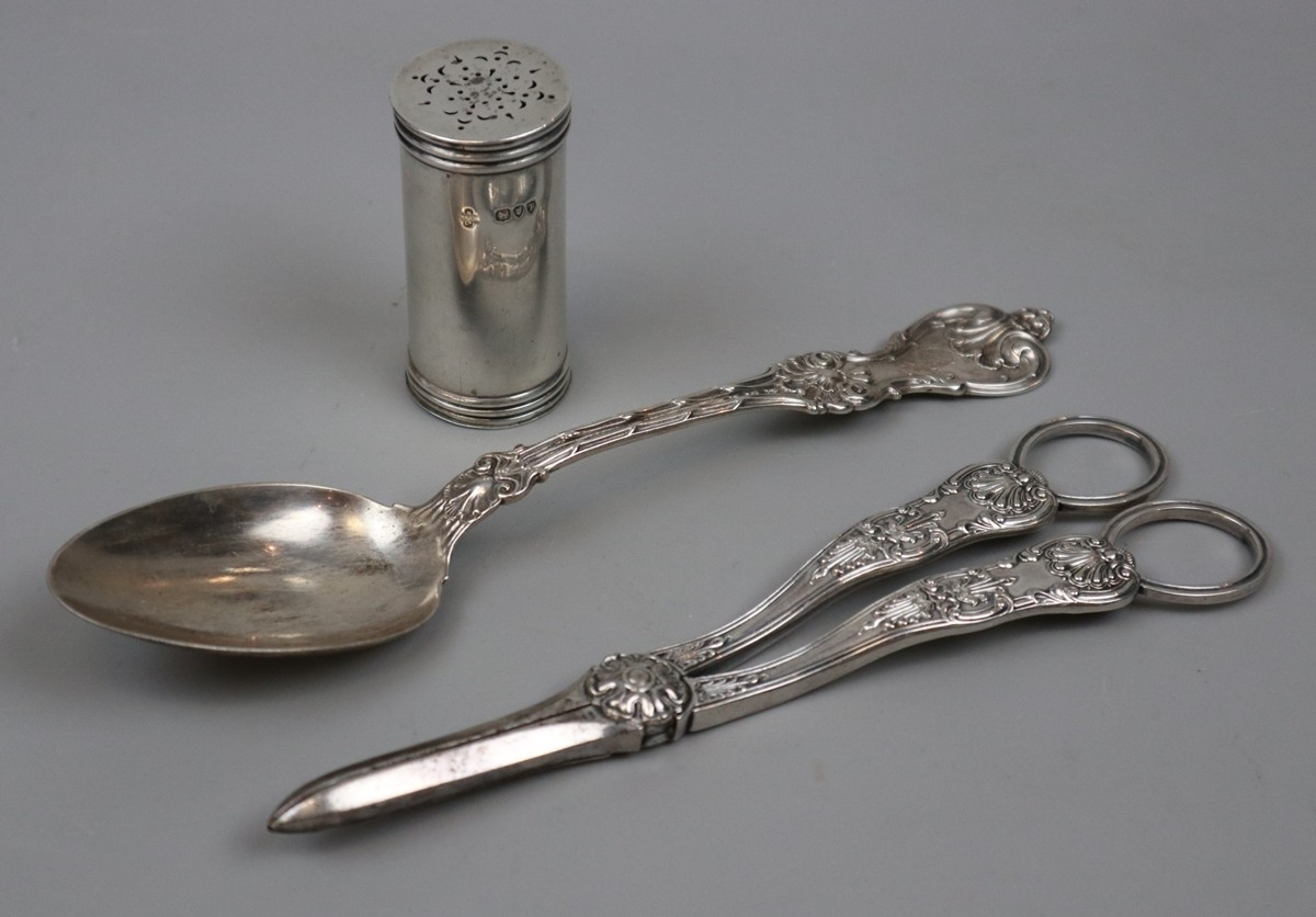 Hallmarked silver pepperette/pounce pot together with silver dessert spoon and decorative white metal grape scissors - Gross weight approx 210g