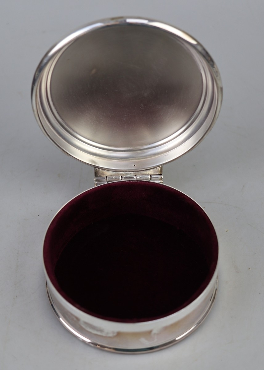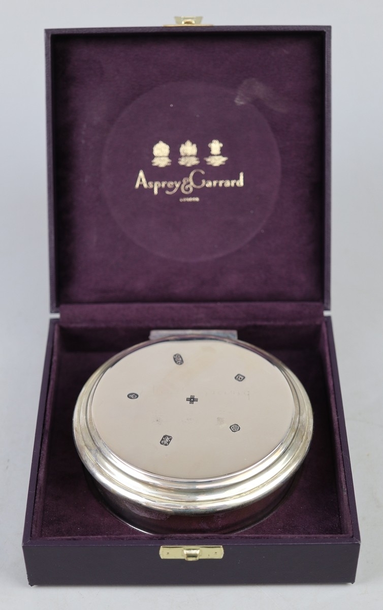 Cased Hallmarked silver round trinket box by Asprey & Ga...