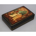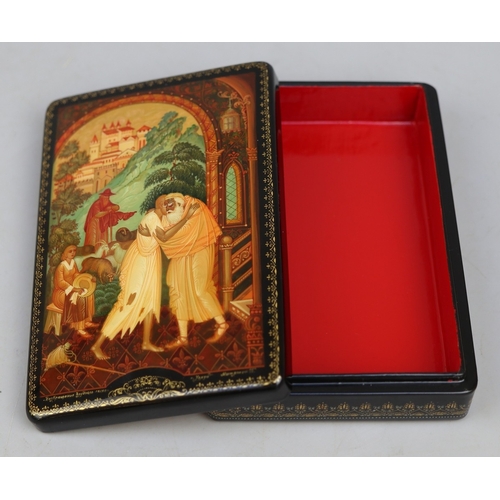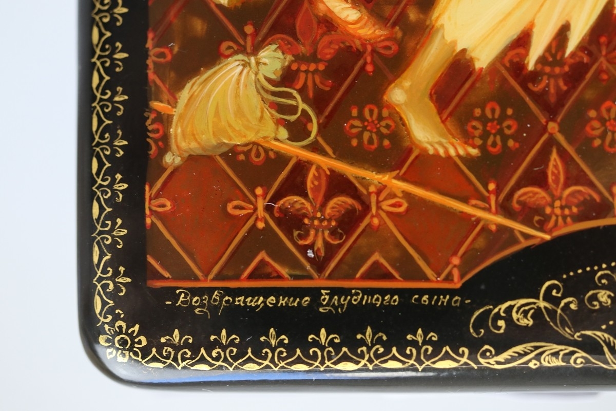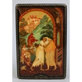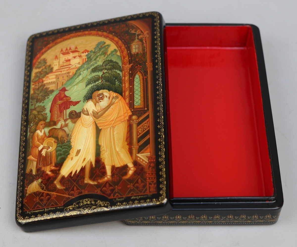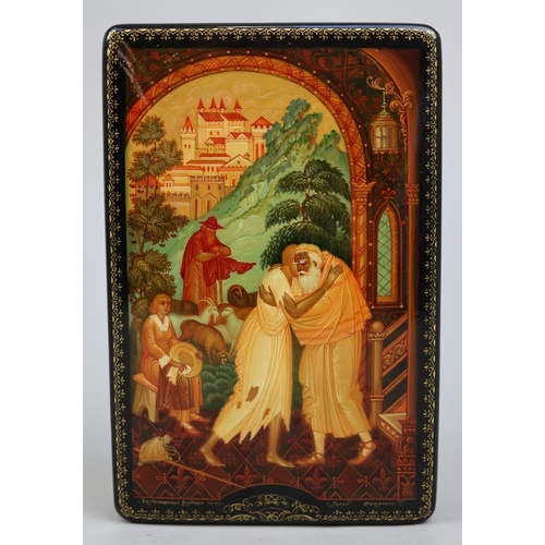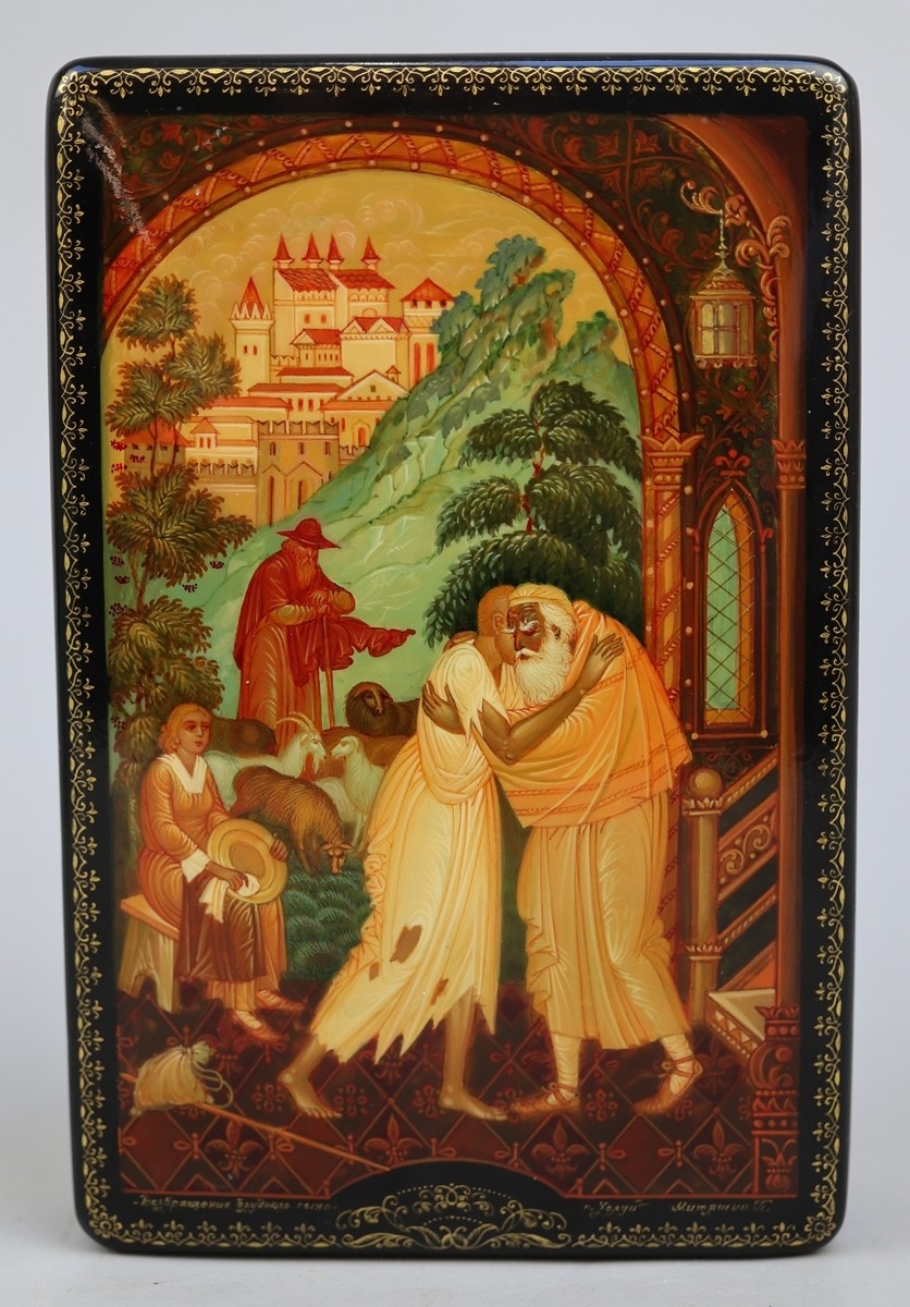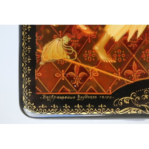 Hand painted Russian lacquered box depicting the Prodigal Son with documents - Approx 15cm x 10cm x 3.5cm