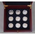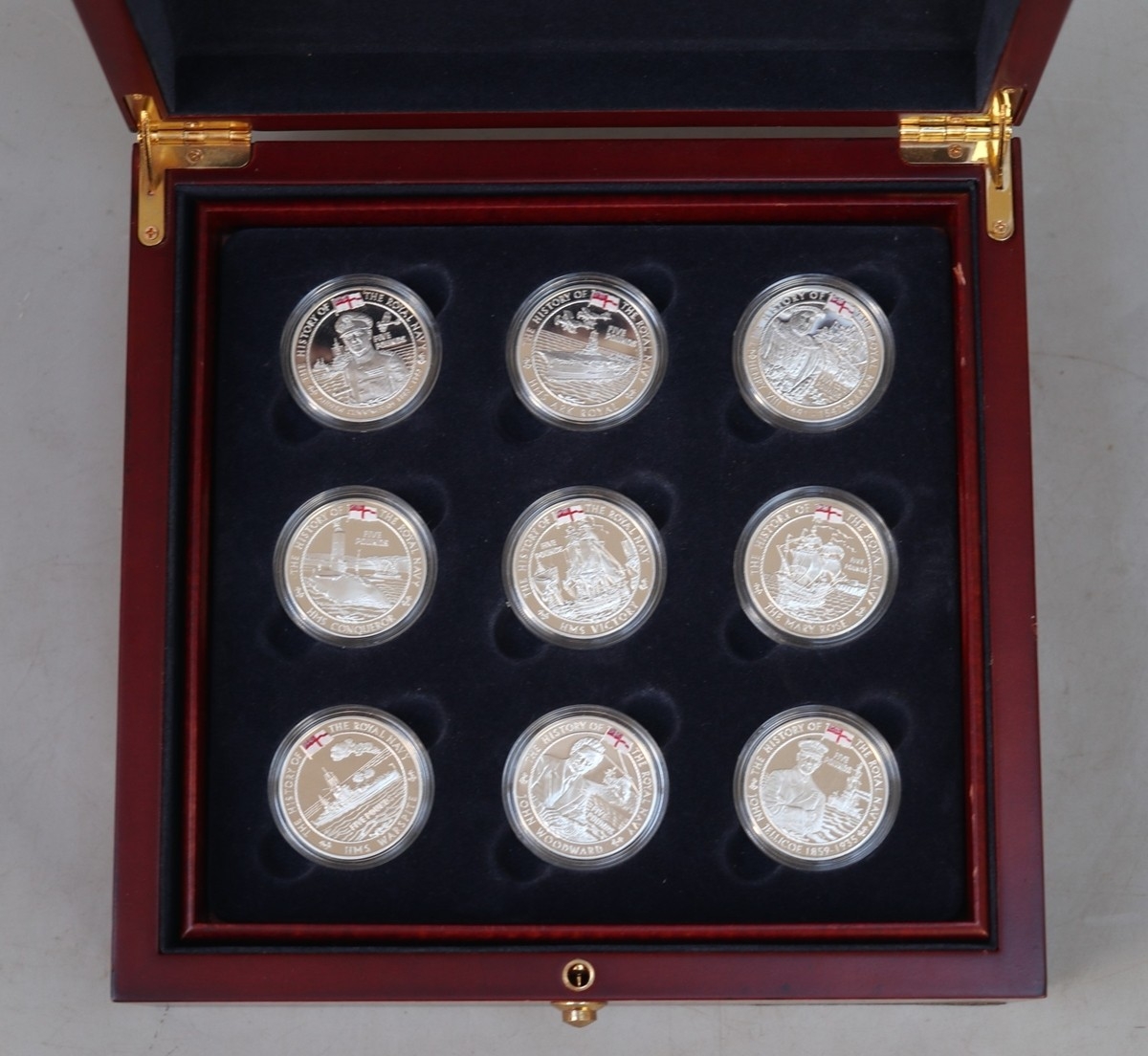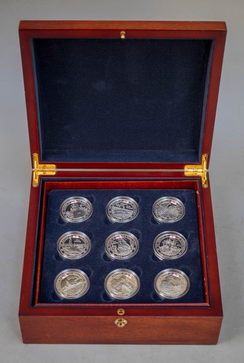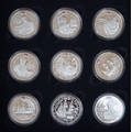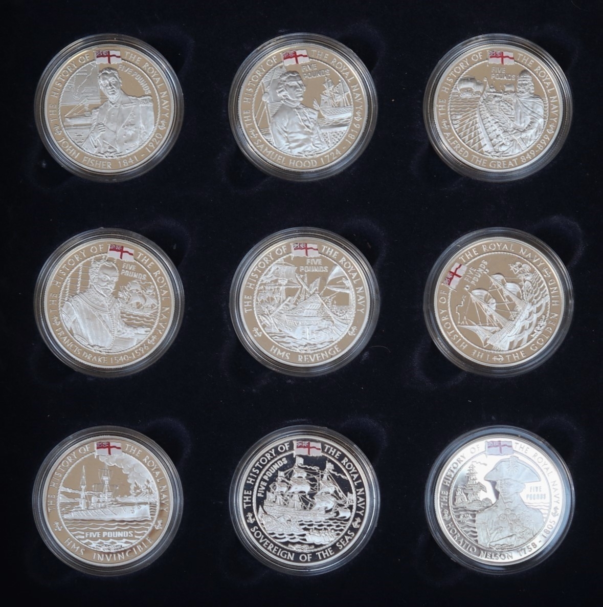 A collection of 18 Silver proof The History of the British Navy, Channel Islands £5 commemorative coins, presented in a fitted display case comprising 2 trays of 9 coins each - Approx 507g